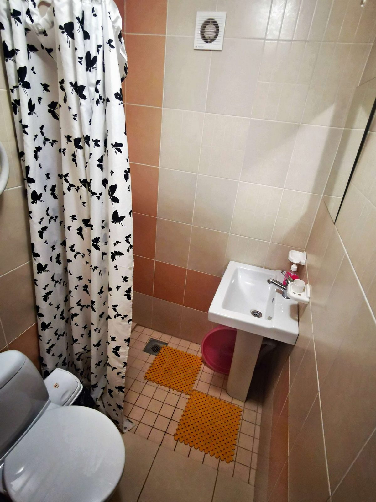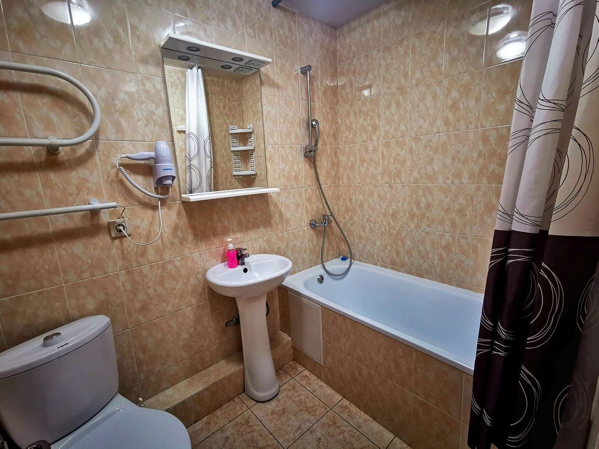 В номере: две спальни, две односпальные кровати или одна двуспальная в каждой комнате, прикроватные тумбы, стол, пуф, малогабаритный диван, шкаф, телевизор, холодильник, кондиционер, стаканы