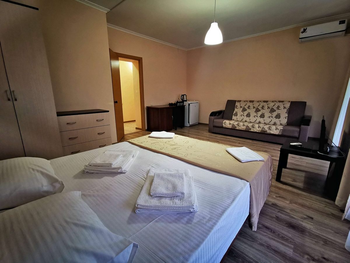 В номере: двуспальная кровать, прикроватные тумбы, стол, стул, диван, шкаф, комод, телевизор, холодильник, кондиционер, электрочайник