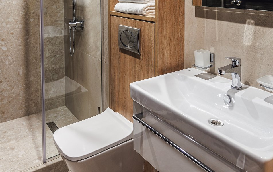 Санузел: душевая кабина, раковина, унитаз, туалетные принадлежности, фен