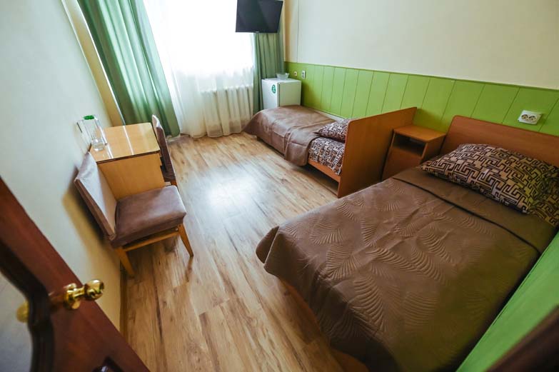 Оснащене номера: вешалка, кровати односпальные, прикроватные тумбочки, стол, стулья, шкаф, сплит-система, телевизор, холодильник
