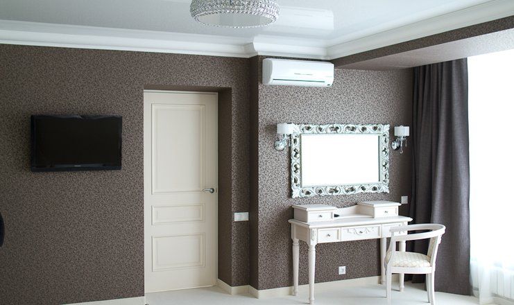 Оснащение номера: двуспальная кровать, прикроватные тумбочки, стол, стулья, кресла, журнальный столик, шкаф для одежды, кондиционер, телевизор, телефон, холодильник