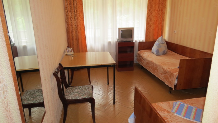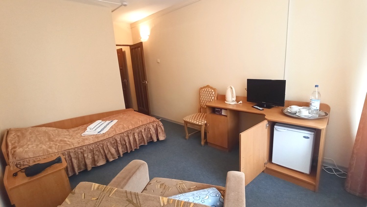 В номере: вешалка, зеркало, кровать односпальная, прикроватные тумбочки, стол, стул, шкаф, раскладушка на доп. место