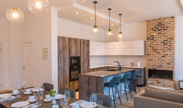 В номере: кухня, вешалка, диван, зеркало, кровать двуспальная, прикроватные тумбочки, стол, стулья, шкаф, гладильная доска, камин, кондиционер, микроволновая печь, набор посуды, посудомоечная машина, стиральная машина, утюг, холодильник, чайный набор посуды, электрическая плита, электрочайник