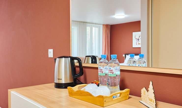В номере: вешалка, диван раскладной, зеркало, кровать двуспальная, прикроватные тумбочки, столик журнальный, столик туалетный, стул, шкаф, мини-холодильник, телевизор ЖК, телефон, чайный набор посуды, электрочайник