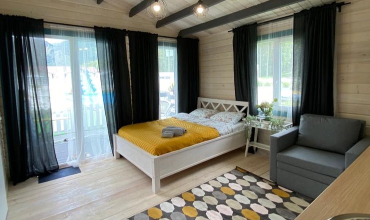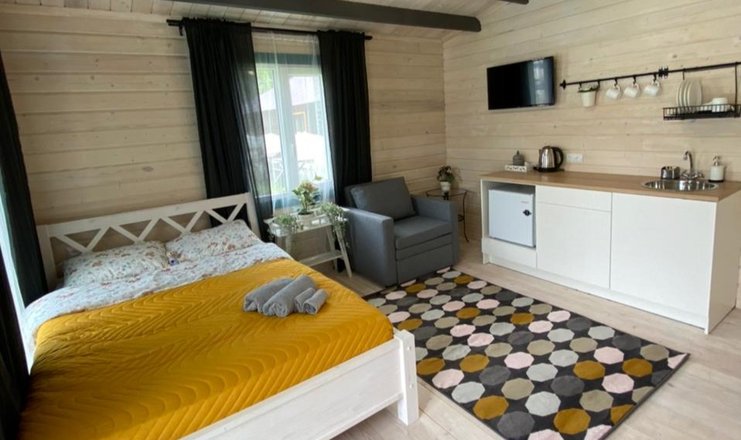 В доме: кресло-кровать, кровать двуспальная: 1 шт., кровать двухъярусная, прикроватный столик, стол, мини-кухня, микроволновая печь, набор посуды, телевизор, холодильник, электрочайник