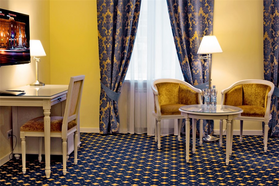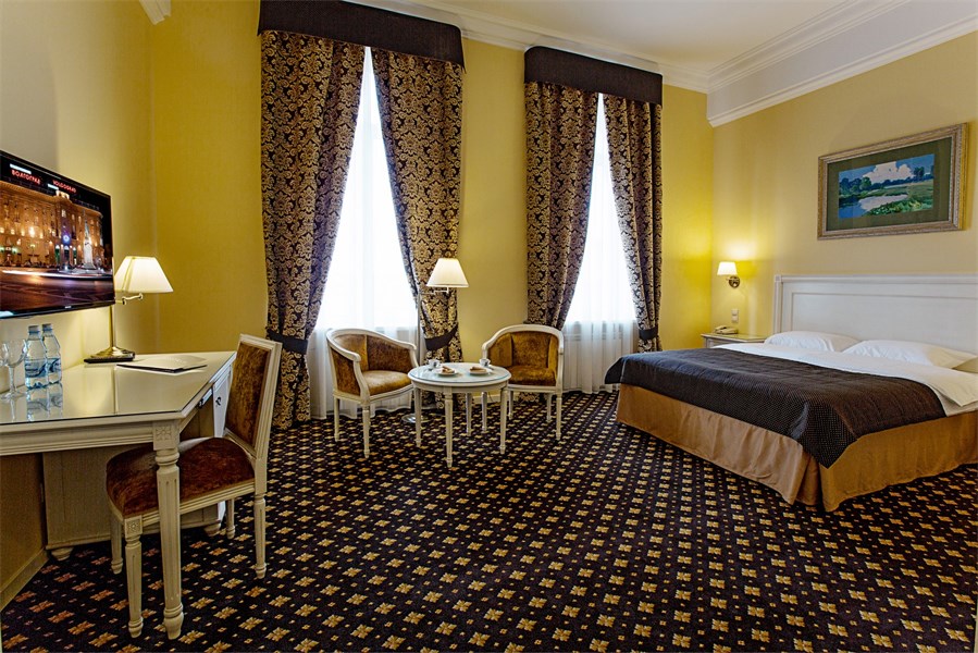 В номере: двуспальная кровать, прикроватные тумбы, стол, стулья, письменный стол, шкаф для одежды, спутниковое телевидение, телевизор, система климат-контроля, мини-бар, сейф, чайный набор