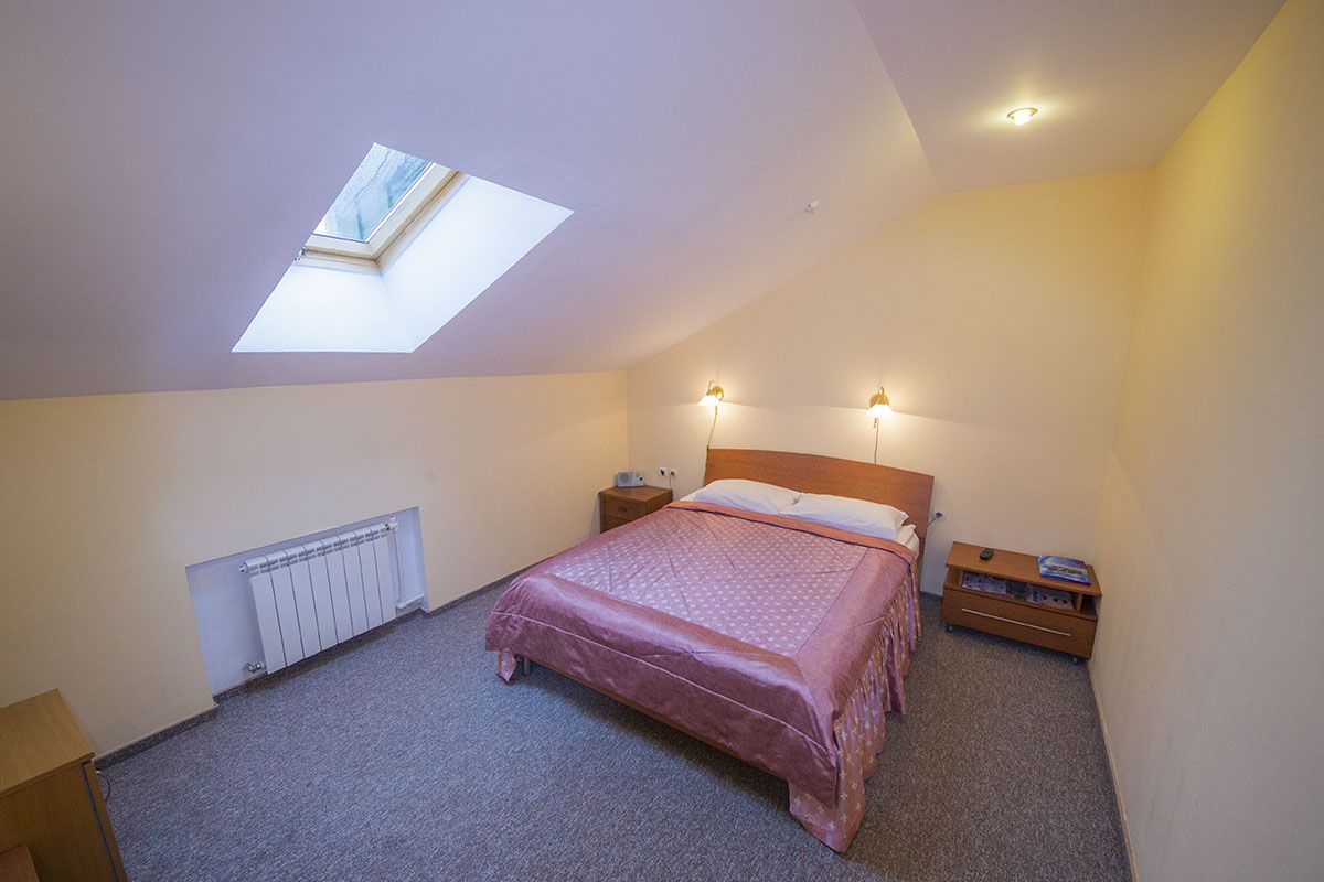 Оснащение номера:  открывающееся мансардное окно на потолке, двуспальная кровать 160 см., раскладной двуспальный диван, шкаф для одежды, стулья, прикроватная тумбочка, ЖК телевизор, фен, сушилка для белья ,сейф, холодильник, вешалка, столик с необходимым набором посуды, чайник