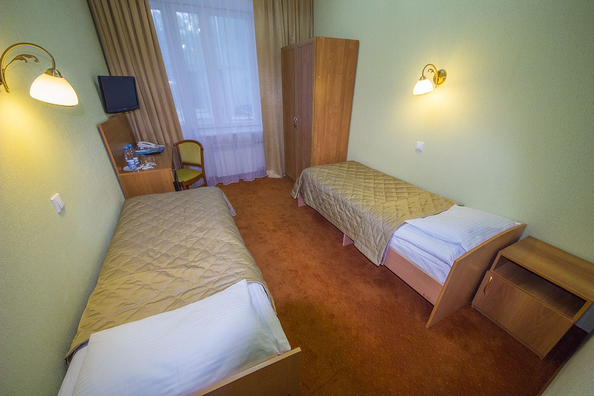 Оснащение номера: номер однокомнатный, 2 односпальные кровати 80 см, шкаф для одежды, стулья, прикроватные тумбочки, ЖК телевизор, фен, сушилка для белья, сейф, застекленный балкон, минихолодильник, вешалка, столик с необходимым набором посуды, чайник